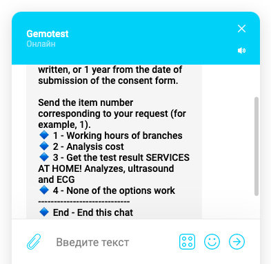 Gemotest Laboratory has changed the approach to communication between the medical facility and the patient. Previously, one had to hang on the phone and wait in line at the call centre to make an appointment, but now it is enough to go to messenger, where the doctor will help with the selection of the desired analysis, and the operator will answer your questions. Communication has become easier and quicker, which means that the client is more likely to come here again.